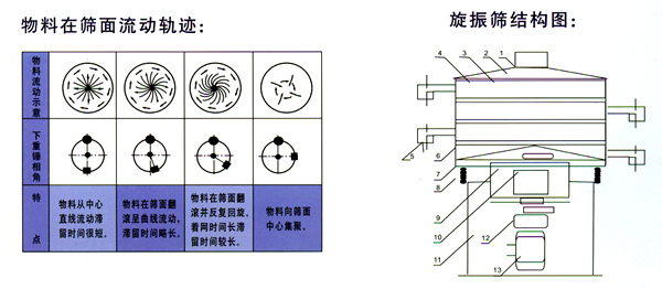 篩體的激振源裝在篩子底部,篩底之上裝有各層篩框及篩網架,各部件緊固后形成整體參振,參振部件由彈簧隔振支撐(橡膠彈簧或圓柱螺旋彈簧)。物料由篩頂部中間孔給料, 排料口在各層篩框側面, 可任意改變位置??臻g相位角與篩面上物料的運動軌跡見圖示。